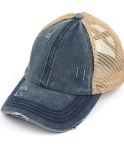 Classic Baseball Style Hat With Stretch Criss-Cross Back Opening For A Mess Bun, High, or Low Ponytail!