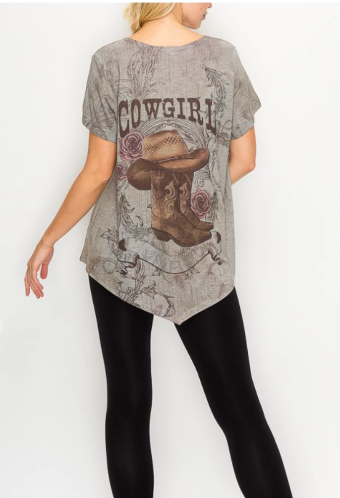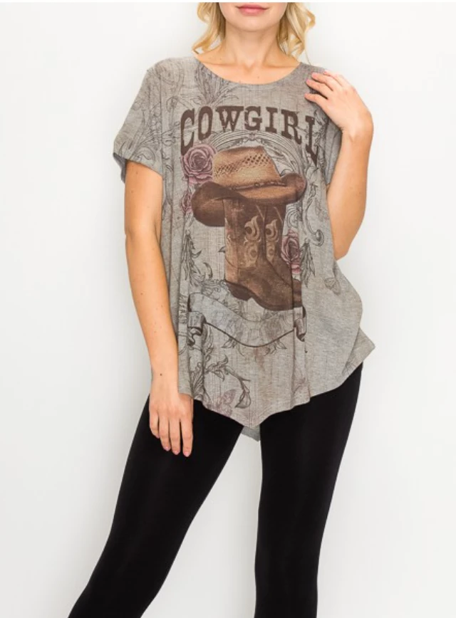 - Grey Top With Cowgirl, Boots, & Hat Design